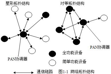 LR-WPAN有两种拓扑结构:星形拓扑结构和对等拓扑结构(图1-1)。在星形拓扑结构中,通信是在设备和一个中心协调器(也称为PAN协调器)之间进行的。设备可以作为发起设备,也可以是终端设备。PAN协调器是一个特殊的应用设备,但是它可以作为发起设备、终端设备或作为路由器。PAN协调器是PAN中的控制设备。运行在任何一种拓扑结构中的设备都应当有其独一无二的64比特扩展地址,这个地址在PAN中用于直接通信,或者当设备同协调器连接以后,用它与PAN协调器分配给它的短地址进行交换。PAN协调器可由交流电供电,而设备由电池供电。星形拓扑网络结构主要用于家庭自动化、PC外围、玩具、游戏设备和个人卫生保健设备。