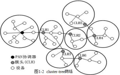 在对等网络中,一个设备在其射频覆盖范围内可与其它任何设备通信。簇形树状网络(Cluster-tree)是对等网络的一个典型拓扑结构。在Cluster-tree网络中大部分设备是FFD,由于RFD在某个时间只能和一个FFD连接,因而它只能作为边缘设备连接到Cluster-tree网络的树枝上。任何FFD都可作为协调器,以便为其它设备和协调器提供同步信息。但在这些协调器中只有一个能成为PAN协调器。在网络中相对于其它设备,PAN协调器具有更强的计算能力。通过把自己作为簇头(簇的标识符为0),选择一个没有使用的PAN标识符,广播信标帧给邻近的其它设备,PAN协调器就组成一个簇。一个设备接受到信标帧后,可请求在簇头处加入网络。如果PAN协调器允许此设备加入,它就把该设备作为子设备添加到它的邻居表中。而这个新加入的设备把簇头作为父设备添加到它自己的邻居表中,并开始发送周期性信标,其它的设备可以通过这个新加入的设备加入到网络当中。如果设备最初不能在簇头处加入到网络中,它就会搜寻其它的父设备以便加入网络。最简单的cluster-tree网络是单簇网络,许多相邻的簇可以结合在一起形成一个更大的网络。