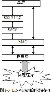 一个LR-WPAN设备包含一个物理层和一个MAC子层(如图1-3),物理层包含RF收发器和它的低电平控制机制;MAC层解决了物理信道的接入方式。图中的高层由网络层和应用层组成。网络层提供网络配置、操作和消息路由。应用层提供设备想要完成的功能。IEEE802.2类型逻辑链路控制(LLC)能通过服务协议汇聚层(SSCS)接入MAC子层。LR_WPAN体系结构可以作为嵌入设备或者作为支持外围设备的请求设备实现,如作为一个PC。
