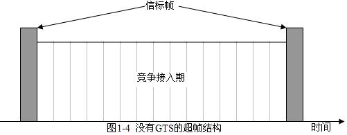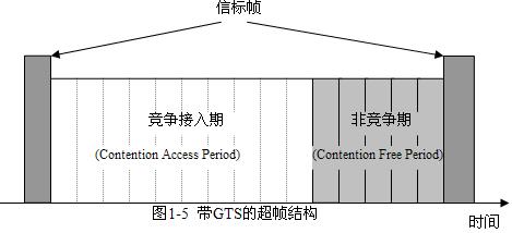 对于应用于低延迟或需要在特定数据带宽的情况下,PAN协调器可以用活动超帧的一部分来实现,这些部分称为保证时隙(GTS),保证时隙形成了非竞争期(CFP),它始终出现在CAP之后和活动超帧之前(如图1-5)。PAN协调器可分配七个GTS,而每个GTS时间不少于一个时隙。然而CAP的有效部分应当保留,使基于竞争的其它网络设备和新设备能接入网络。所有基于竞争的传输应当在CFP开始之前完成,同时每个工作在GTS时期的设备应当确保它的传输在下一个GTS开始和CFP的结束之前完成。