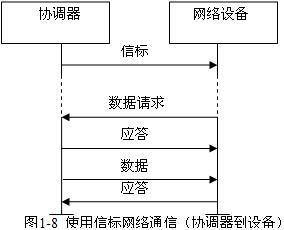 在使用信标的网络中,当协调器需要向其它设备传输数据时,网络信标就表明有待发送的数据。设备周期性监听网络信标,当有消息发送时,设备就使用时隙CSMA-CA传输MAC子层请求命令。协调器通过发送可选应答帧予以应答,表示已接受MAC子层请求命令。接着,协调器使用时隙CSMA-CA接入机制发送数据帧。设备成功接收后,通过发送应答帧予以确认,整个过程完成如图1-8所示。