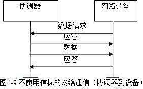 当协调器在不使用信标的网络中向设备传输数据时,它为适当的设备储存数据,用以连接且发送请求命令。设备使用非时隙CSMA-CA接入机制,并以定义的速率发送MAC子层请求命令来连接协调器。协调器通过发送应答帧以确认成功接受请求命令。当有待发送的数据时,协调器使用时隙CSMA-CA接入机制向设备发送该数据。如果没有数据需要发送,则协调器就发送一个净载荷长度为零的数据帧以表示没有数据发送。设备接收到数据后,通过发送应答帧予以确认。整个过程如图1-9所示。