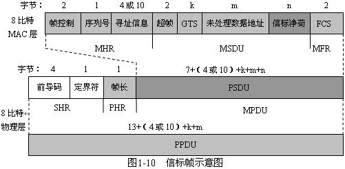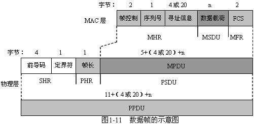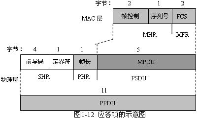 图1-12显示了应答帧的结构,它由MAC子层发起。MAC子层应答帧由MHR和MFR组成。MHR包含MAC帧控制域和数据序列号;MFR由16比特的FCS形成。