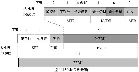 图1-13显示了MAC命令帧的结构,它由MAC子层发起。MSDU由命令类型域和命令数据域(命令净载荷)构成。在MSDU前面加上MHR,后面加上MFR就形成MAC命令帧,也就是MPDU。其中MHR包含MAC帧控制域、数据序列号和寻址信息域;MFR包含16比特FCS。接着MPDU传输到物理层形成物理层命令帧净载荷,也就是PSDU。在PSDU的前面加上SHR和PHR就形成物理层命令分组,也就是PPDU。其中,SHR包含前导序列(保证接收机和符号同步)和SFD域构成;PHR包含PSDU的长度值(字节表示)。