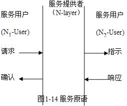 每一层的服务可以通过建立它下层的服务上的功能,来为它上层或者子层里的用户提供服务。图1-14说明了原语的概念,它描述了服务层次的关系,以及两个通信的N用户和它们的相连的N层(子层)对等协议实体之间的关系。