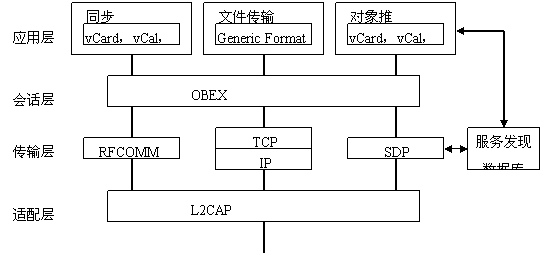 参考下图,OBEX在蓝牙系统中被映射到RFCOMM和TCP/IP层之上,其中OBEX over TCP/IP是作为可选项出现的。需要说明的是,由于在蓝牙体系结构中,OBEX被映射到的是面向连接的底层协议,因此蓝牙仅支持面向连接的OBEX应用,在这一点上,IrDA同时支持面向连接和无连接的应用。