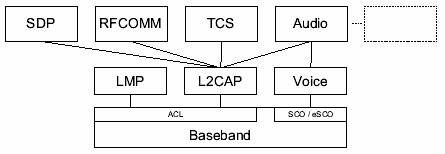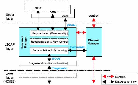 L2CAP的功能要求包括协议/信道复用、分段和重组(segmentation and reassembly,SAR)、每个信道的流控制、差错控制和组管理。下图表示了在蓝牙协议栈中的L2CAP数据流。L2CAP在链路控制协议之上,和其他一些上层通信协议相接,例如:Service Discovery Protocol 服务发现协议(SDP), RFCOMM 电缆替代协议, Telephony Control (TCS)音频与电话控制协议和 Bluetooth Network Encapsulation Protocol (BNEP)蓝牙网络封装协议等。音频与电话应用和同步透明连接的话音质量信道通常在同步逻辑传输上进行。分组后的音频数据,例如IP电话,可以通过在L2CAP之上的通信协议进行传输。