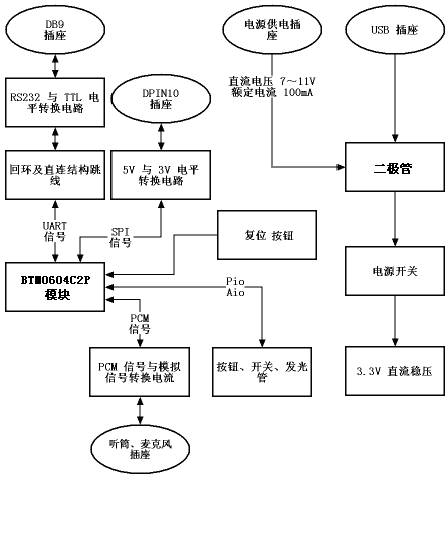 这是用来演示表贴模块 带PCM语音口BTM0604C2P 蓝牙模块的演示板及测试开发工具。它能够完整的演示出这一模块的串口通讯能力、语音通讯能力和 I/O 口驱动能力,还能够实现 I/O 口的状态采集,以及蓝牙模块的程序下载。