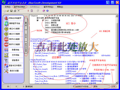 BTP102是中国第一套真正完全自主知识产权的蓝牙开发平台产品,并且已经申请了国家专利。 该平台可以提供RS232、USB接口供用户进行开发、调试使用,音频接口可进行蓝牙语音的传输。在软件设计上更采用了友好的全中文界面,非常适合国内各科研院所、大专院校、厂家研发机构开展对蓝牙应用软件和产品的开发和研究,学习HCI指令、测试蓝牙设备。 全中文界面,可在Windows98/Windows2000/Windows XP下运行。